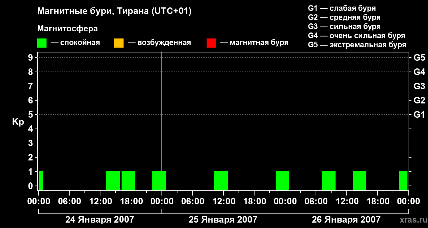 Изменения геомагнитного индекса Kp с 24 по 26 января 2007 года для средних широт