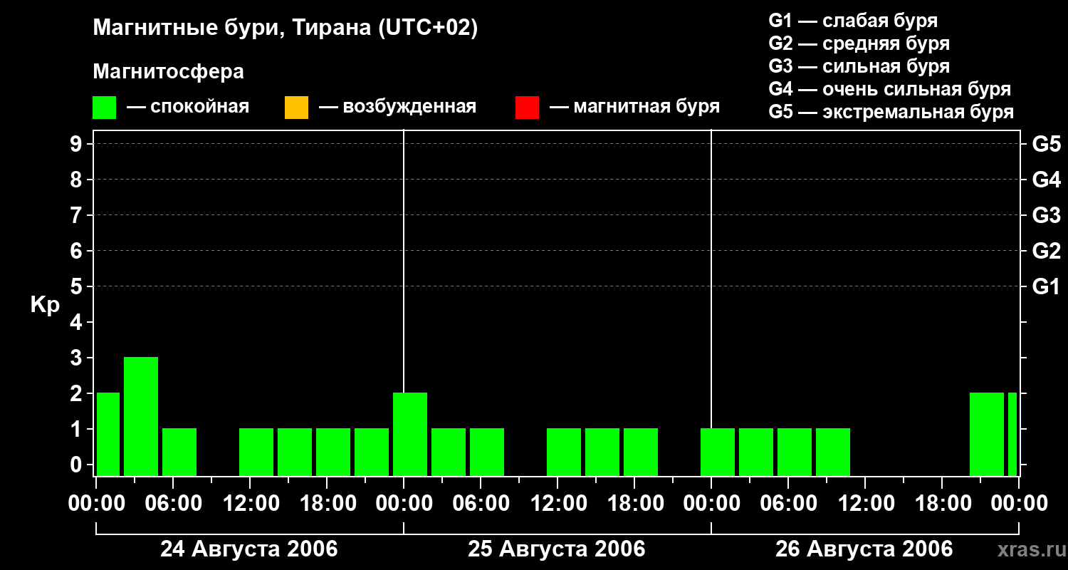 Изменения геомагнитного индекса Kp с 24 по 26 августа 2006 года для средних широт