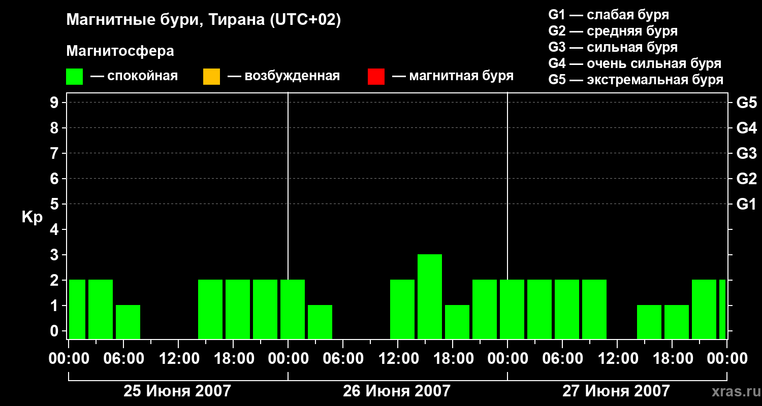 Изменения геомагнитного индекса Kp с 25 по 27 июня 2007 года для средних широт