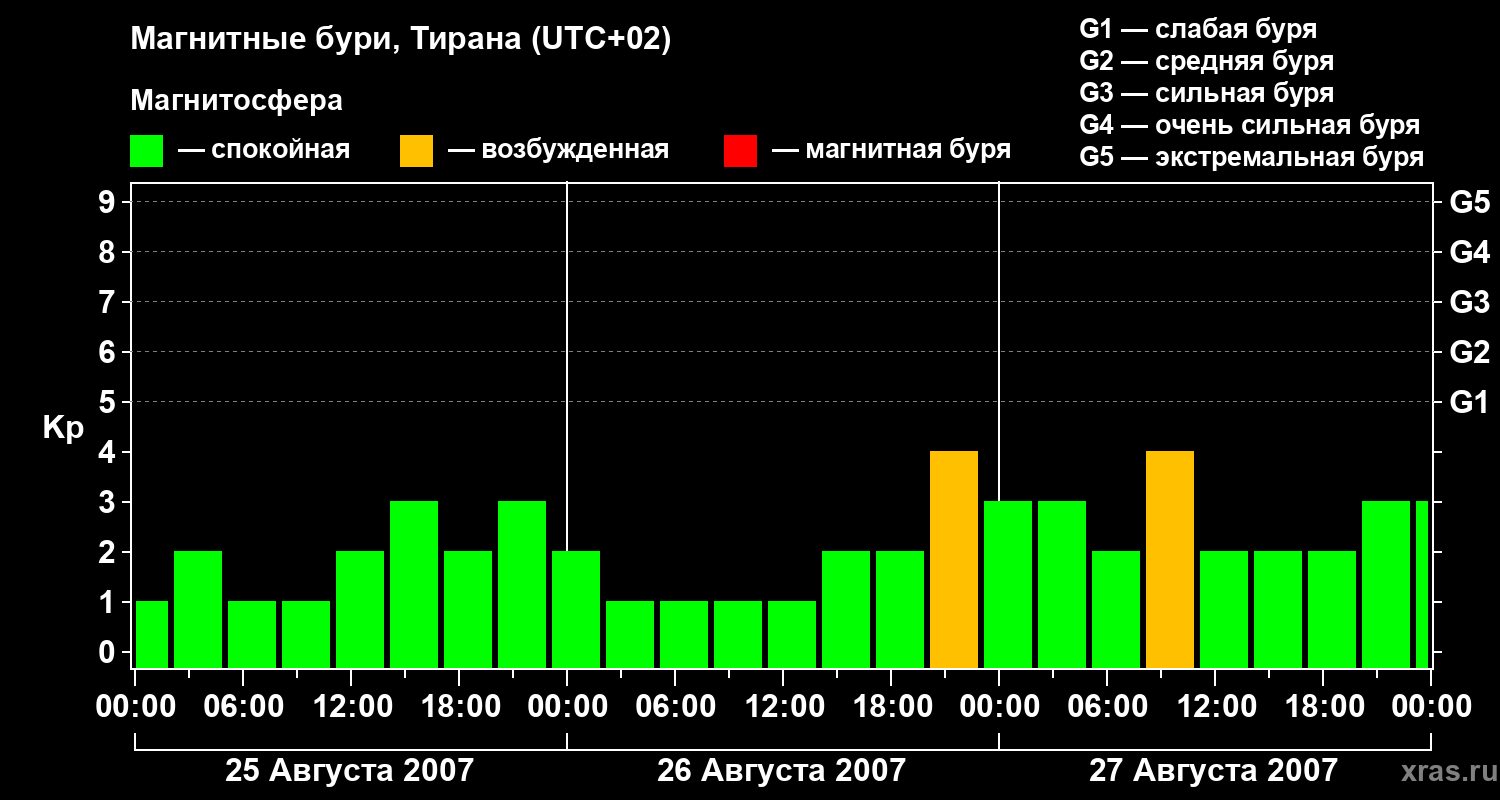 Изменения геомагнитного индекса Kp с 25 по 27 августа 2007 года для средних широт