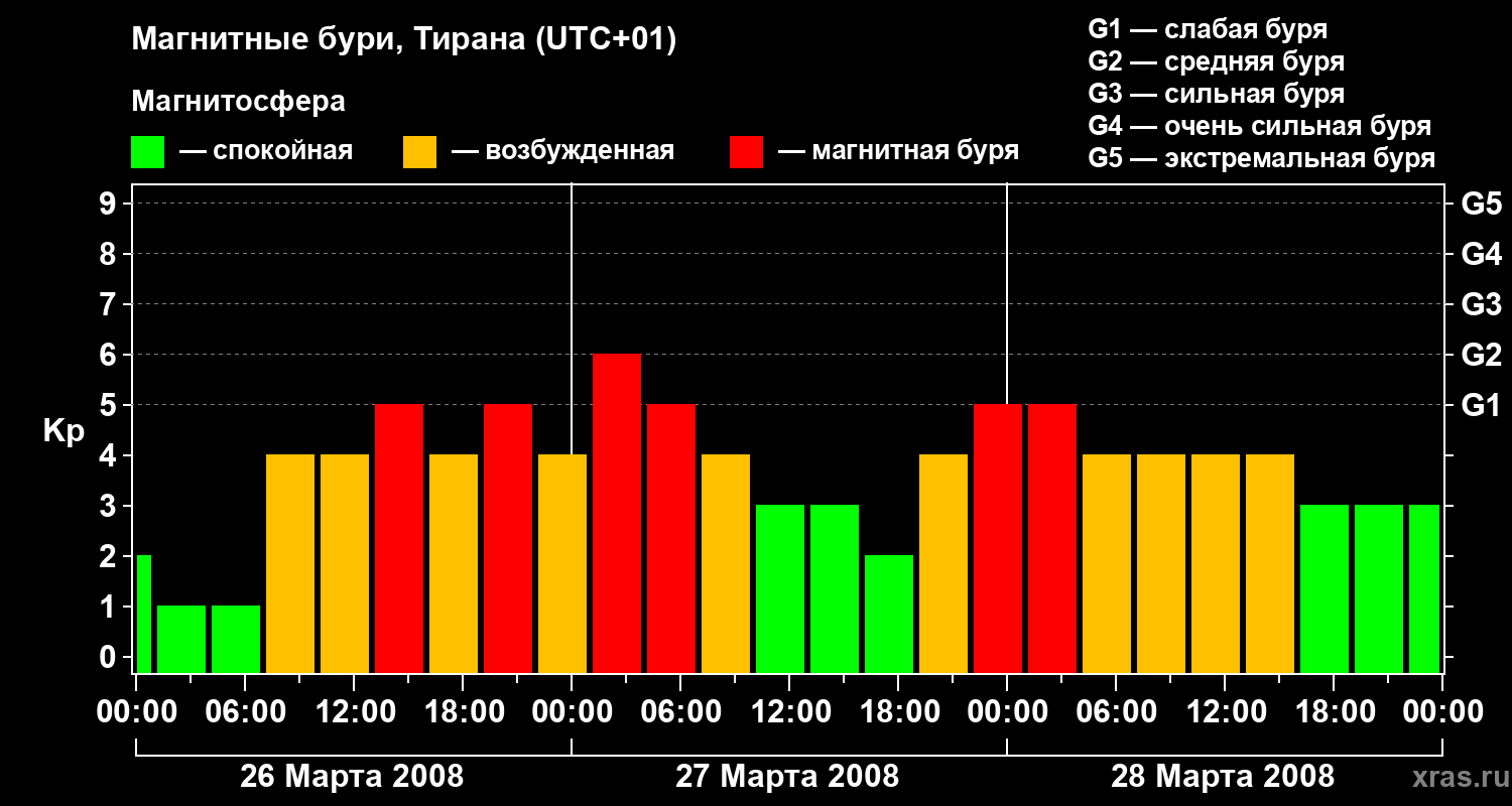 Изменения геомагнитного индекса Kp с 26 по 28 марта 2008 года для средних широт