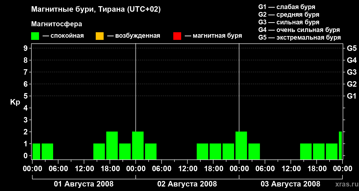 Изменения геомагнитного индекса Kp с 1 по 3 августа 2008 года для средних широт