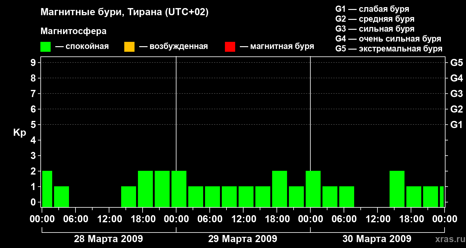 Изменения геомагнитного индекса Kp с 28 по 30 марта 2009 года для средних широт