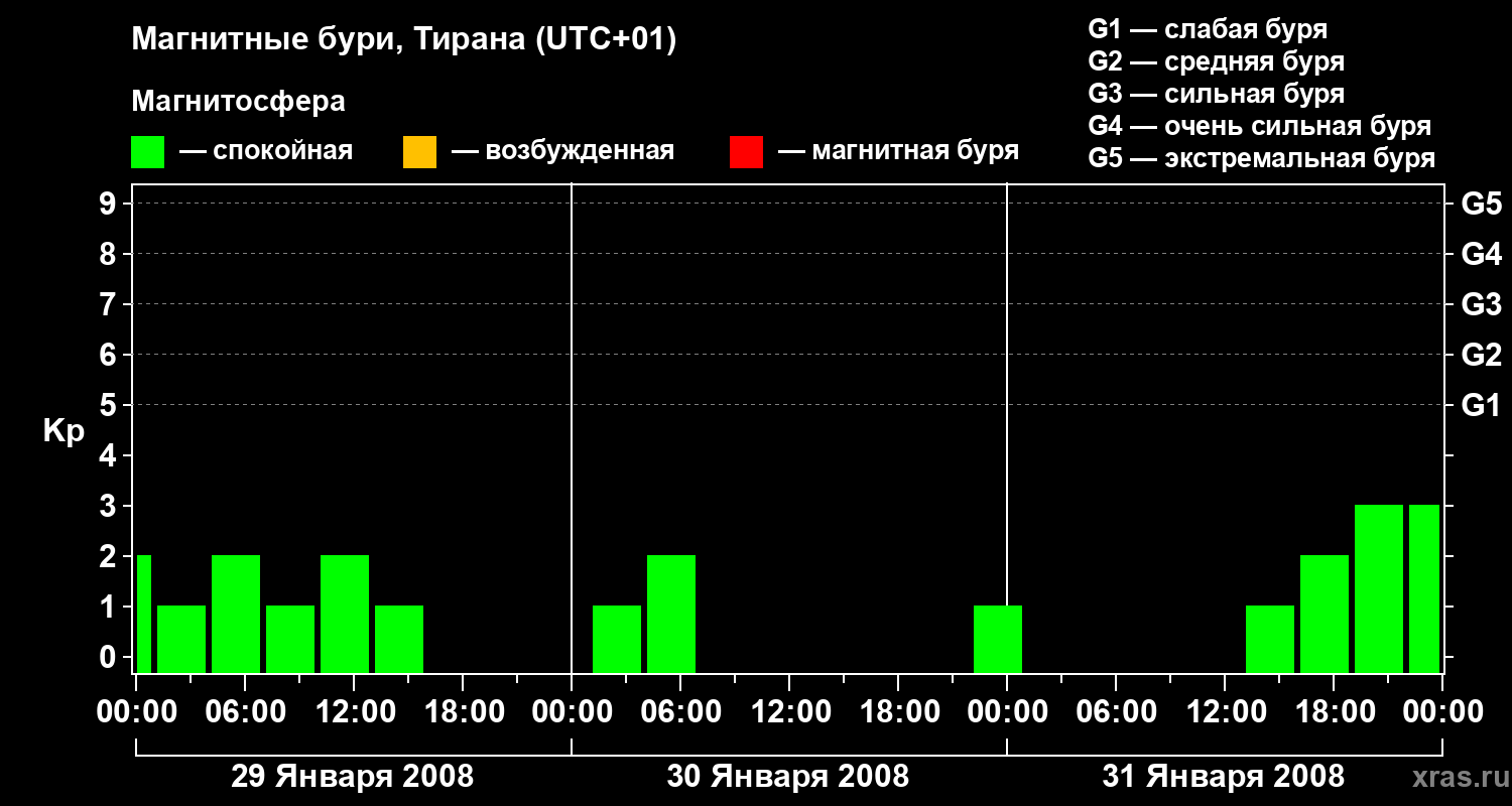 Изменения геомагнитного индекса Kp с 29 по 31 января 2008 года для средних широт