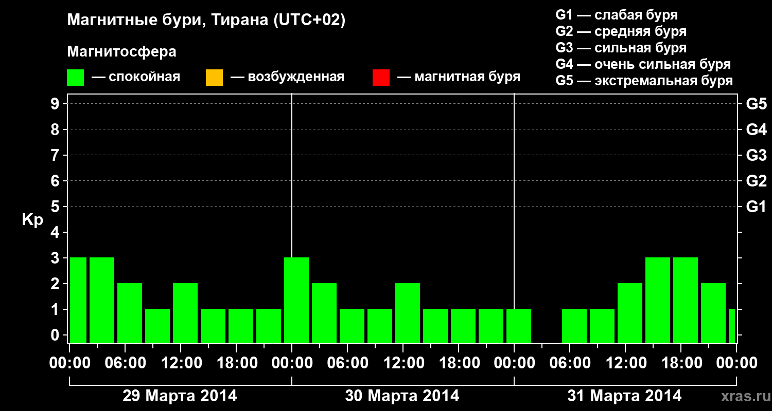 Изменения геомагнитного индекса Kp с 29 по 31 марта 2014 года для средних широт