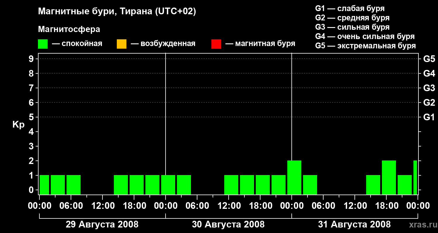 Изменения геомагнитного индекса Kp с 29 по 31 августа 2008 года для средних широт
