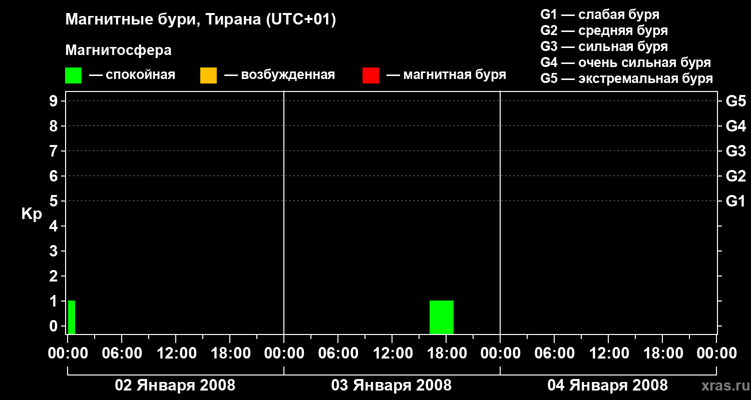 Изменения геомагнитного индекса Kp с 2 по 4 января 2008 года для средних широт