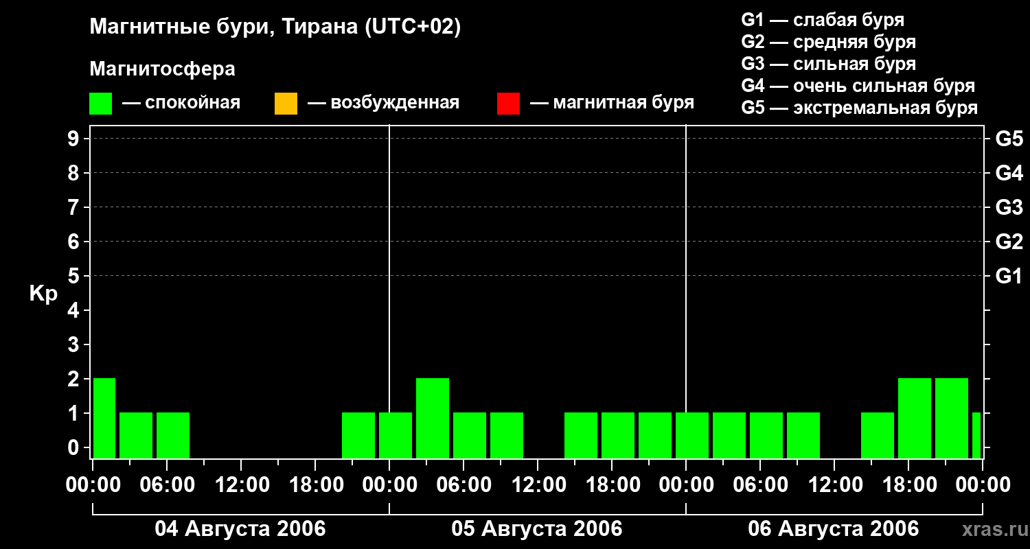 Изменения геомагнитного индекса Kp с 4 по 6 августа 2006 года для средних широт