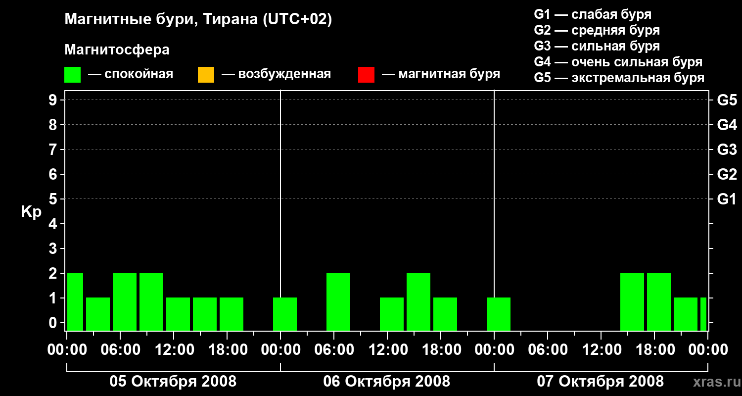 Изменения геомагнитного индекса Kp с 5 по 7 октября 2008 года для средних широт