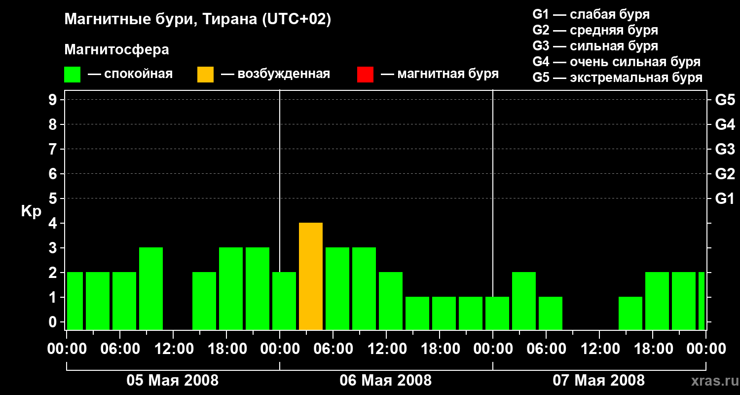 Изменения геомагнитного индекса Kp с 5 по 7 мая 2008 года для средних широт