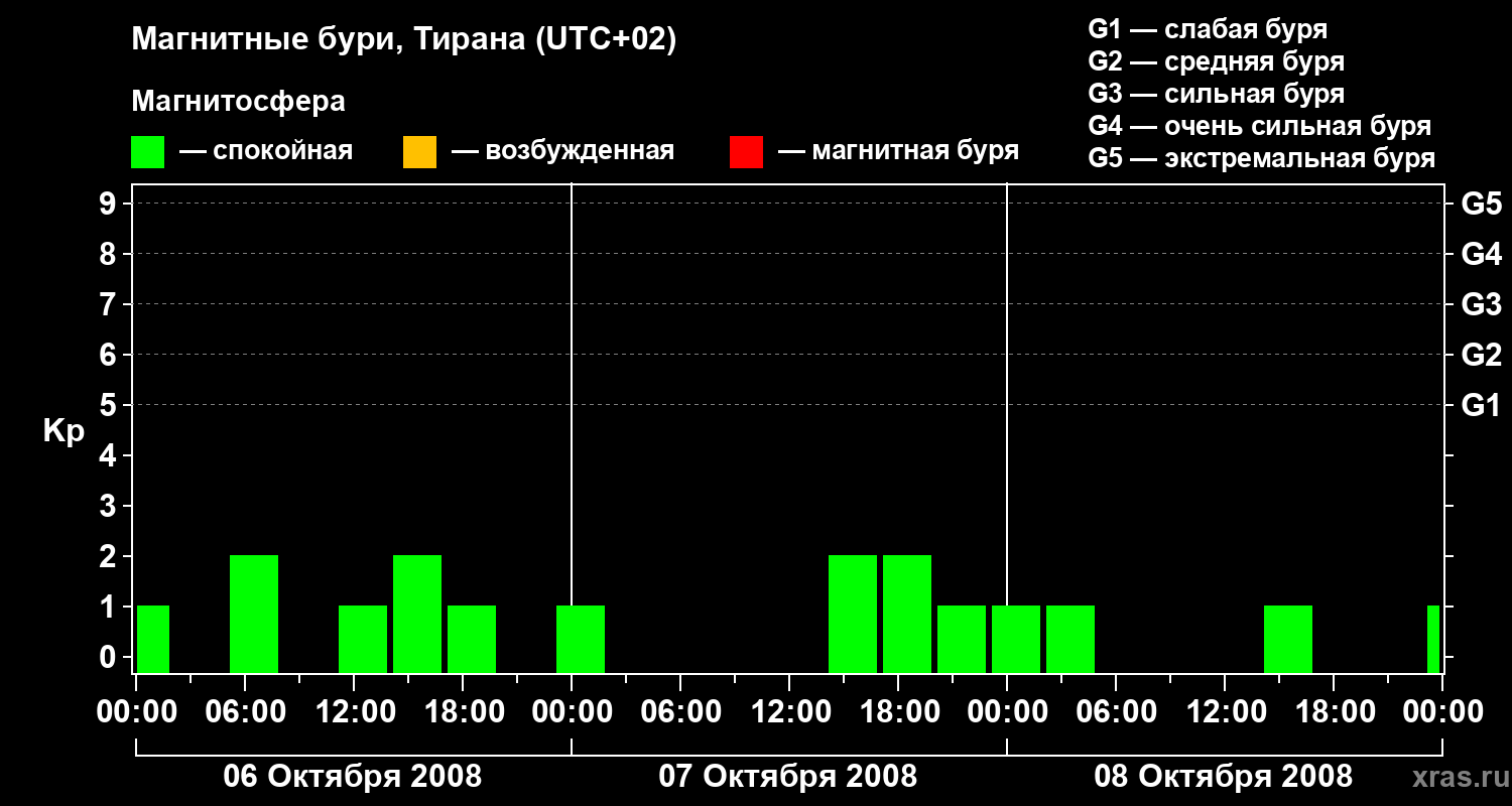 Изменения геомагнитного индекса Kp с 6 по 8 октября 2008 года для средних широт