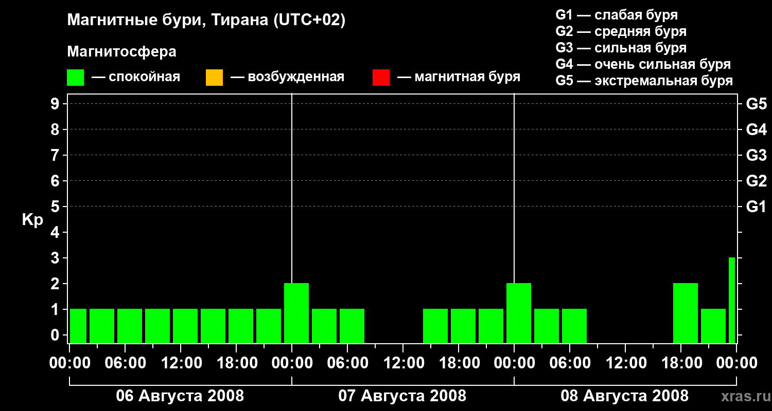 Изменения геомагнитного индекса Kp с 6 по 8 августа 2008 года для средних широт