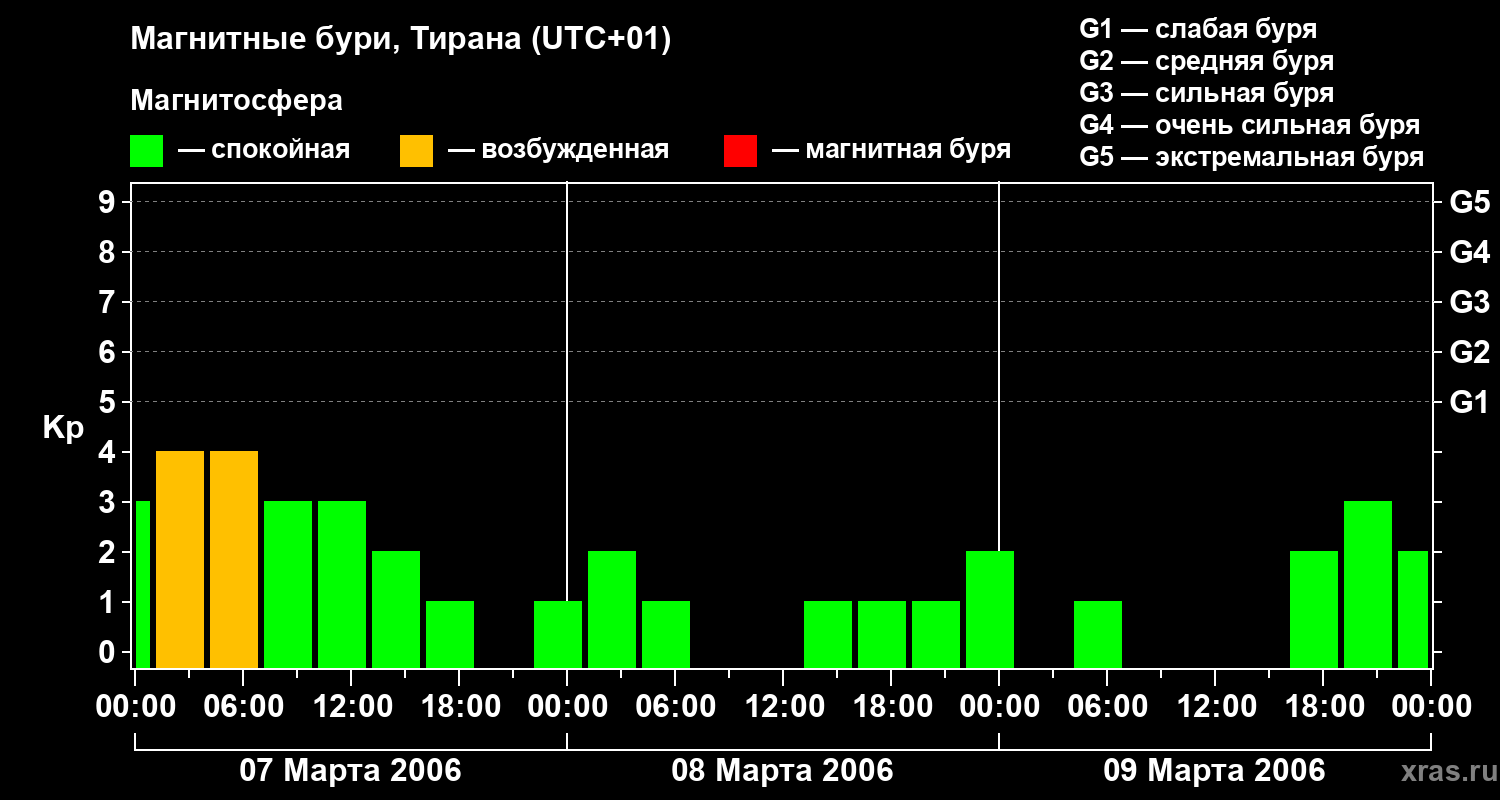 Изменения геомагнитного индекса Kp с 7 по 9 марта 2006 года для средних широт