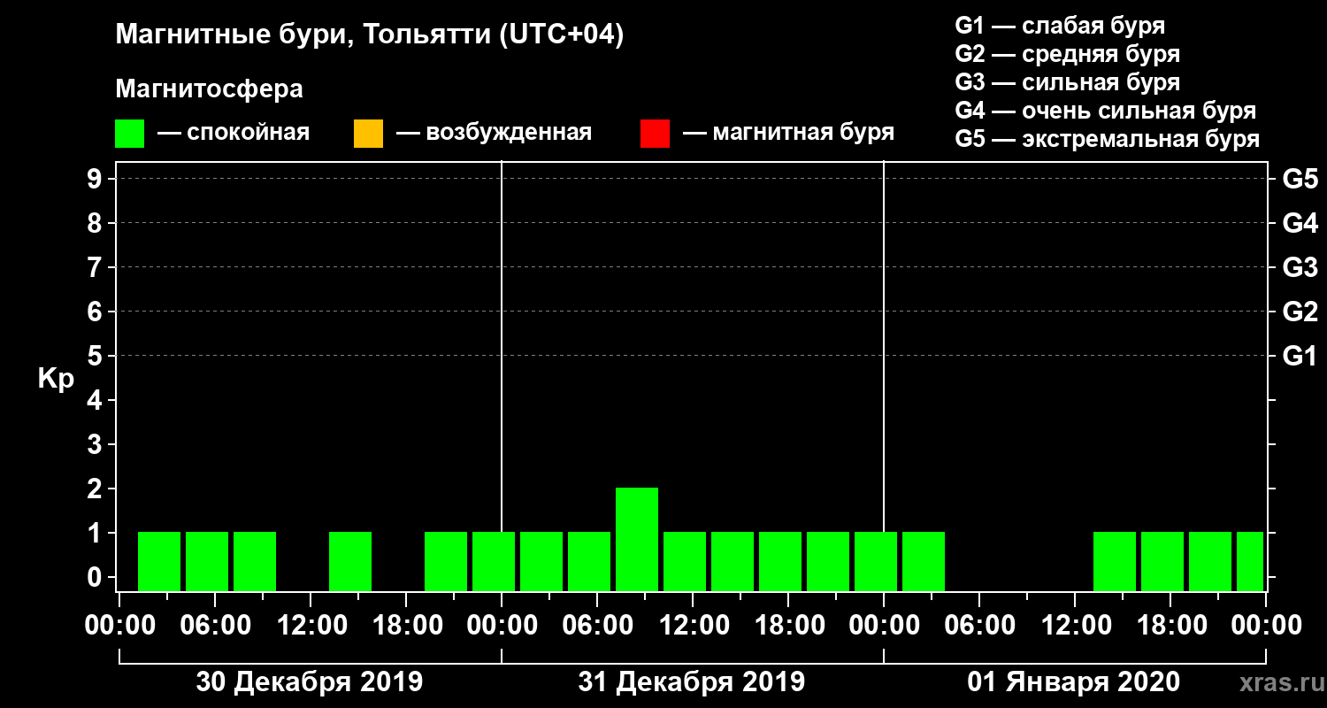 Изменения геомагнитного индекса Kp с 30 декабря 2019 года по 1 января 2020 года для средних широт