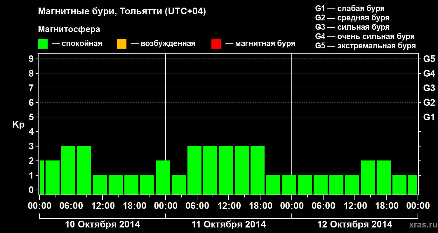 Изменения геомагнитного индекса Kp с 10 по 12 октября 2014 года для средних широт