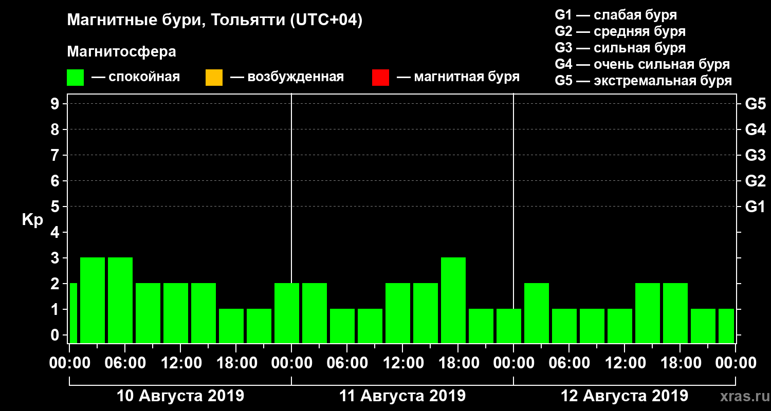 Изменения геомагнитного индекса Kp с 10 по 12 августа 2019 года для средних широт