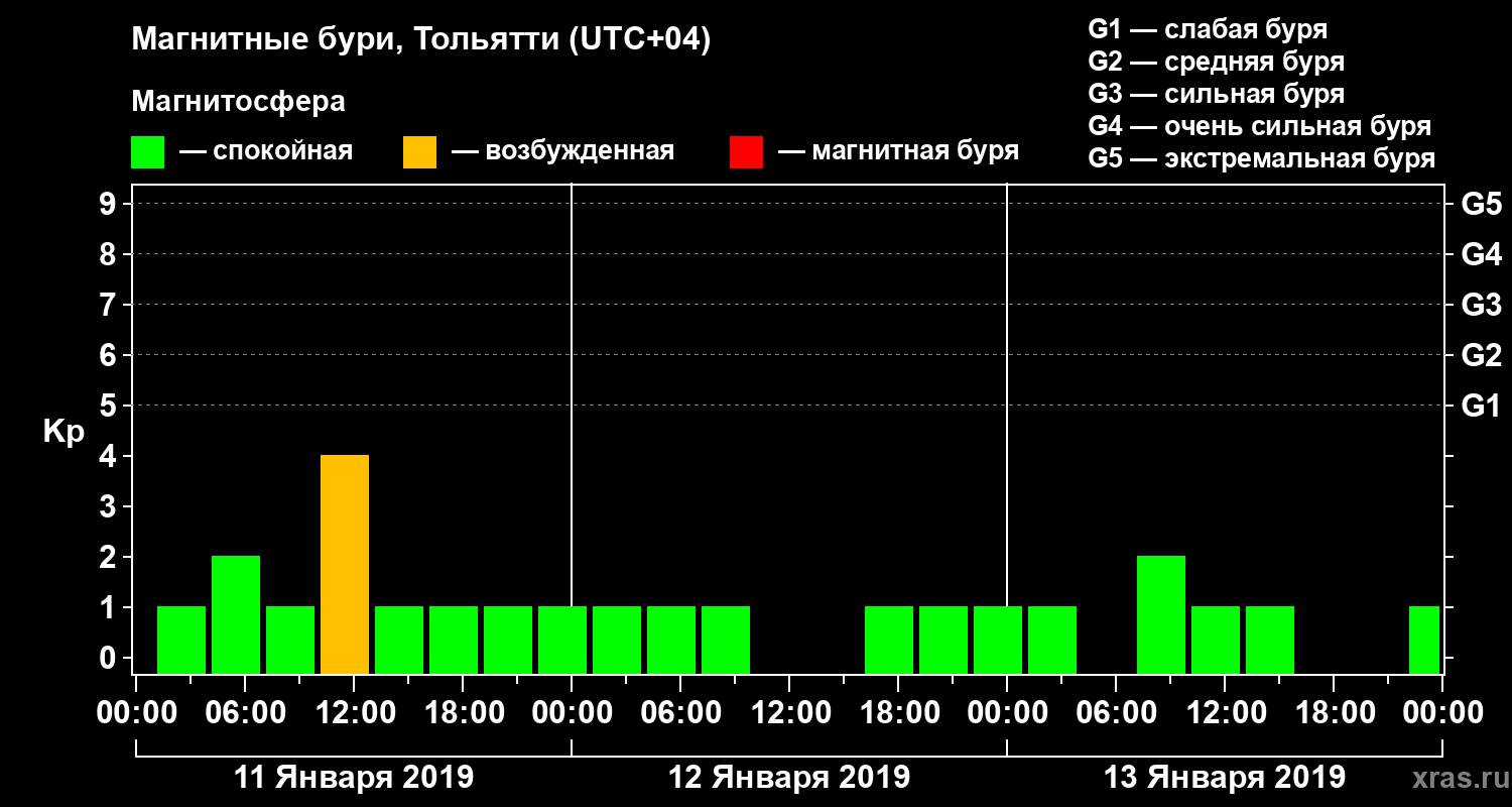 Изменения геомагнитного индекса Kp с 11 по 13 января 2019 года для средних широт