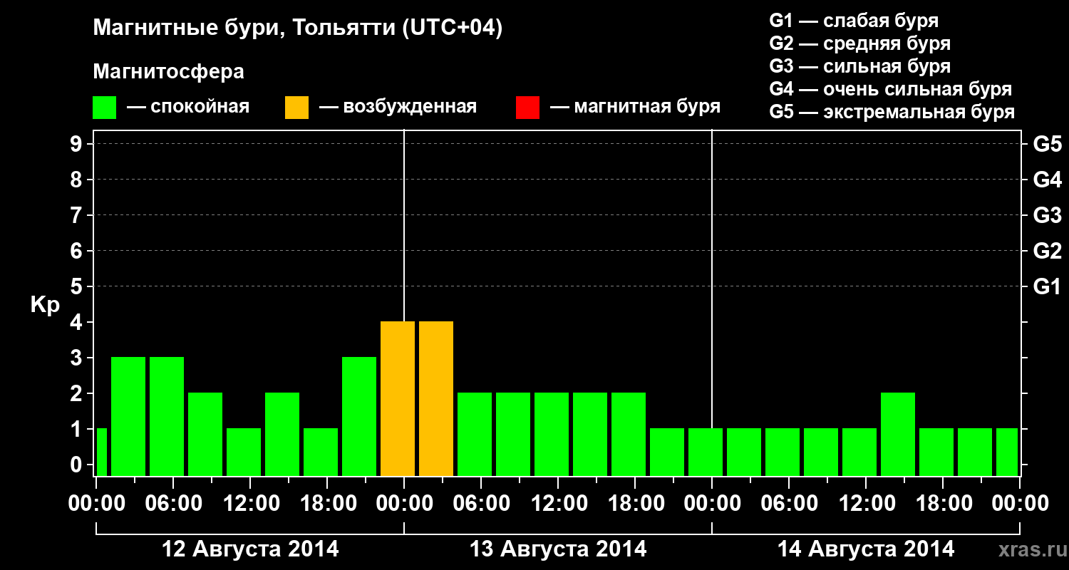 Изменения геомагнитного индекса Kp с 12 по 14 августа 2014 года для средних широт