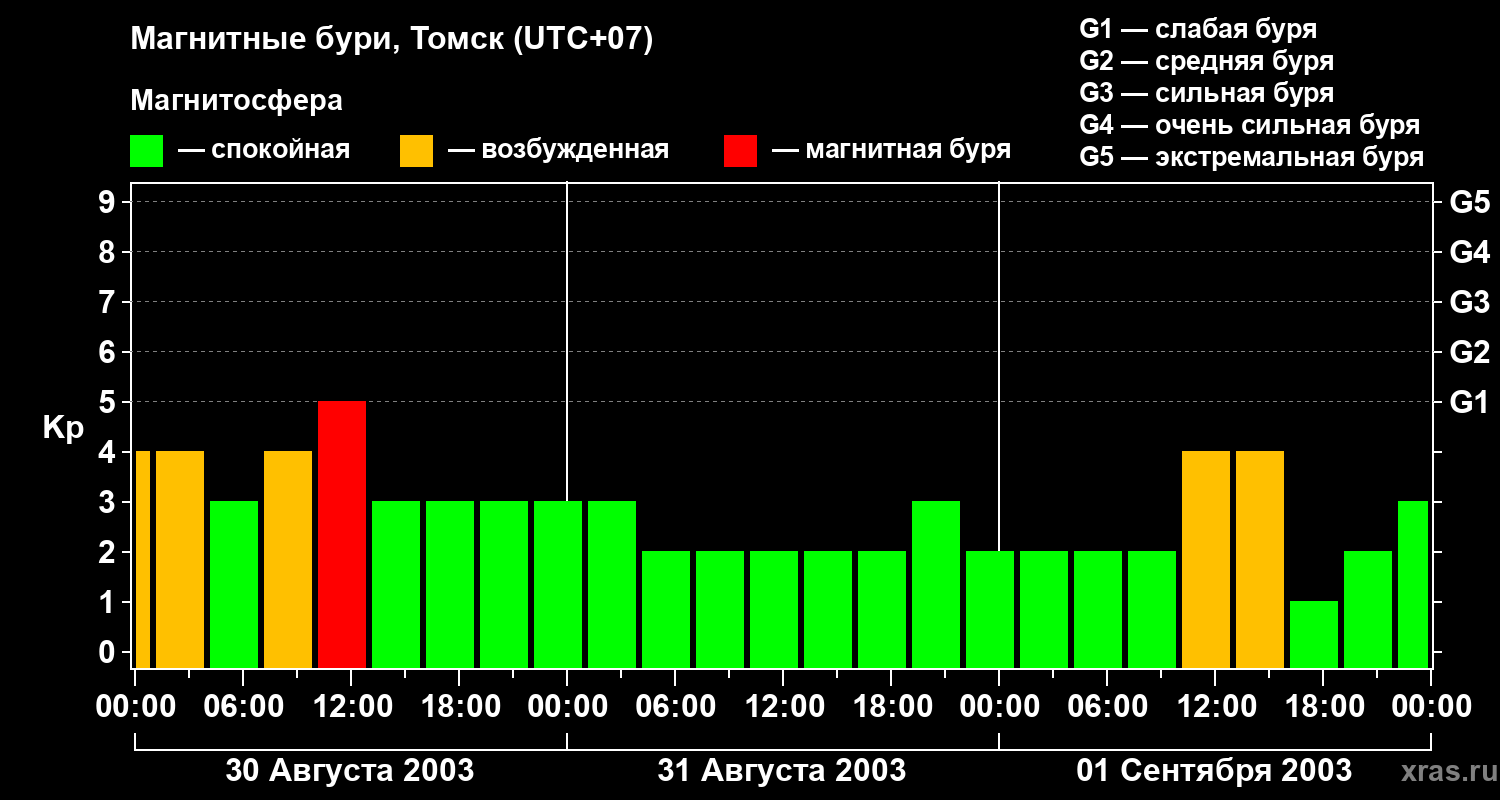 Изменения геомагнитного индекса Kp с 30 августа по 1 сентября 2003 года для средних широт
