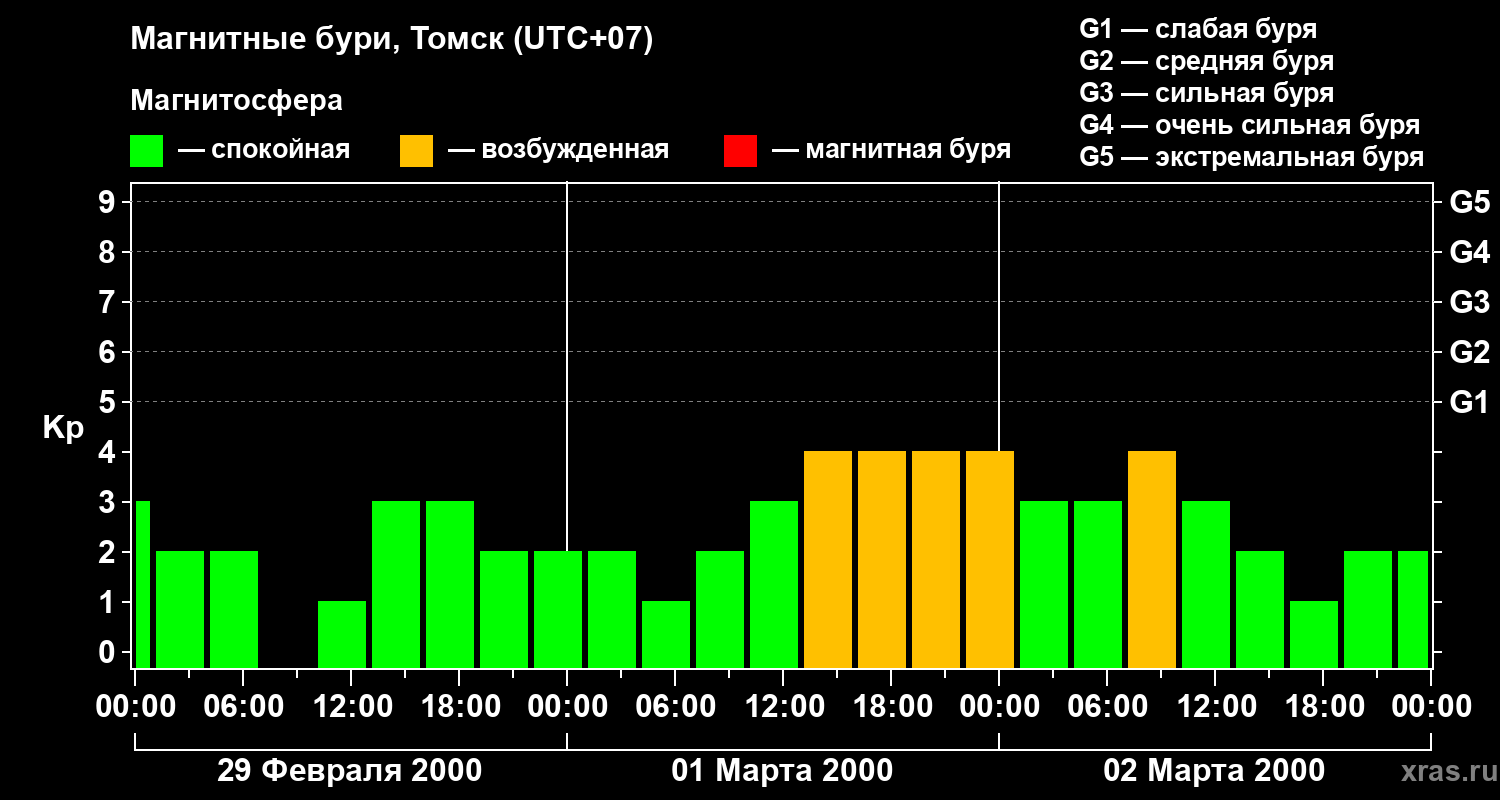 Изменения геомагнитного индекса Kp с 29 февраля по 2 марта 2000 года для средних широт
