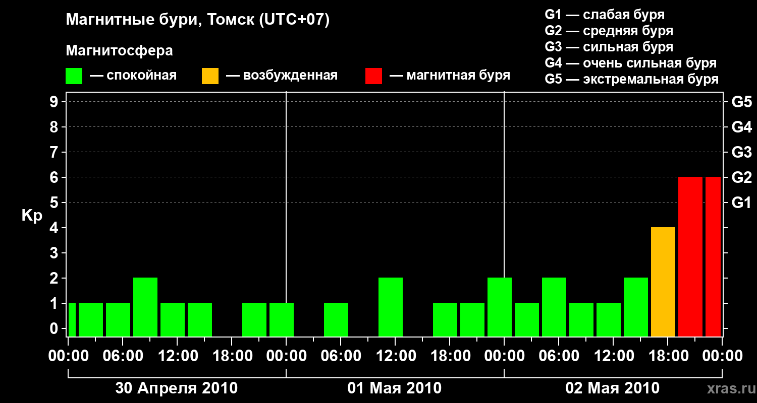 Изменения геомагнитного индекса Kp с 30 апреля по 2 мая 2010 года для средних широт