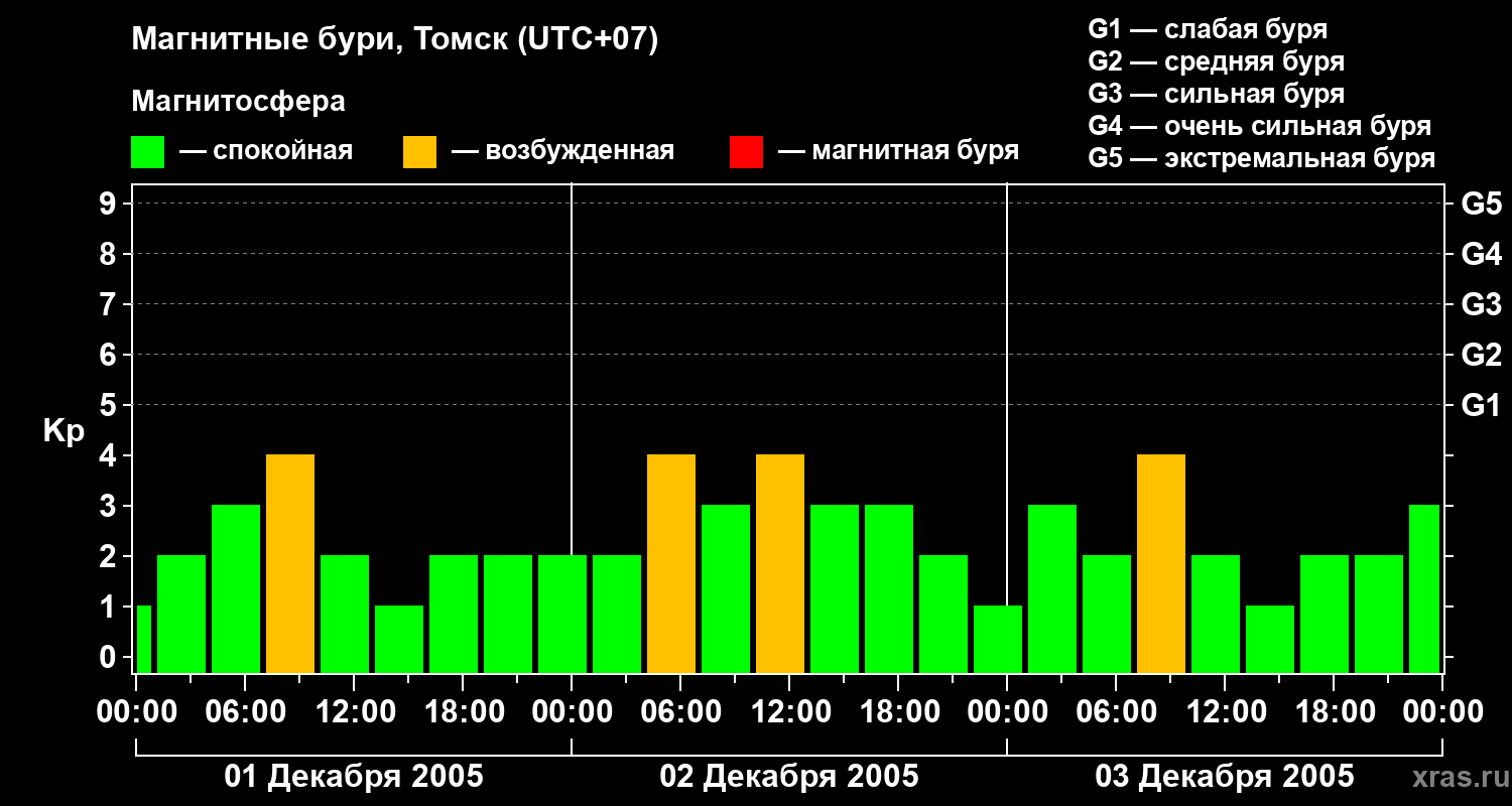 Изменения геомагнитного индекса Kp с 1 по 3 декабря 2005 года для средних широт