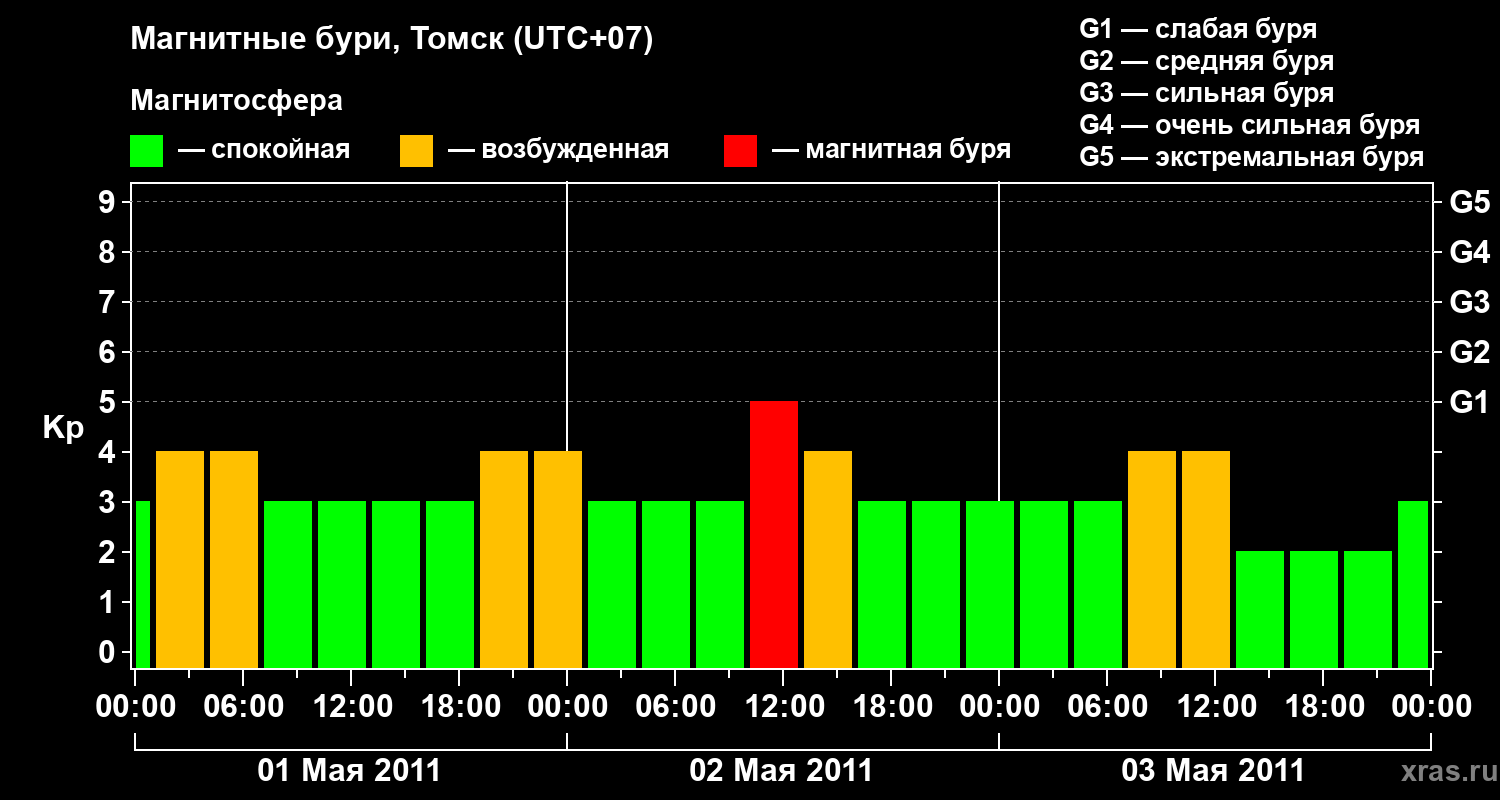 Изменения геомагнитного индекса Kp с 1 по 3 мая 2011 года для средних широт
