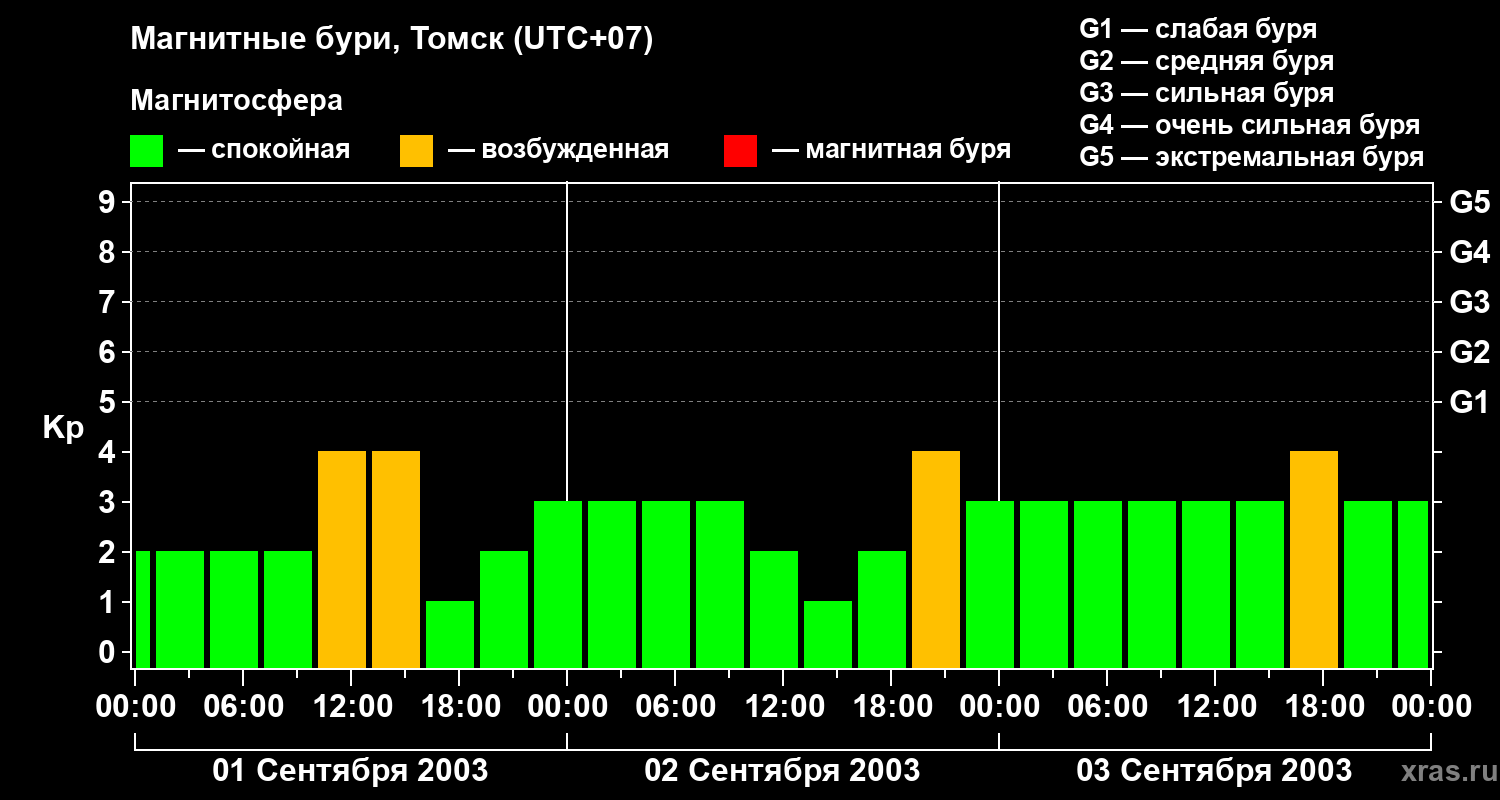 Изменения геомагнитного индекса Kp с 1 по 3 сентября 2003 года для средних широт