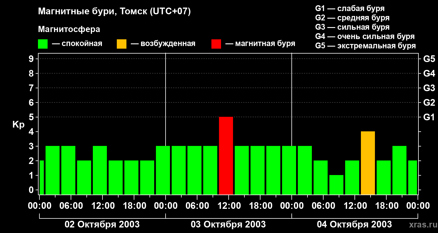 Изменения геомагнитного индекса Kp с 2 по 4 октября 2003 года для средних широт