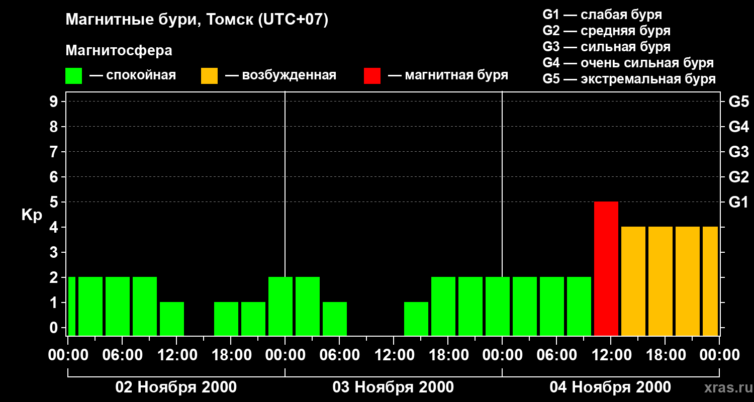 Изменения геомагнитного индекса Kp с 2 по 4 ноября 2000 года для средних широт