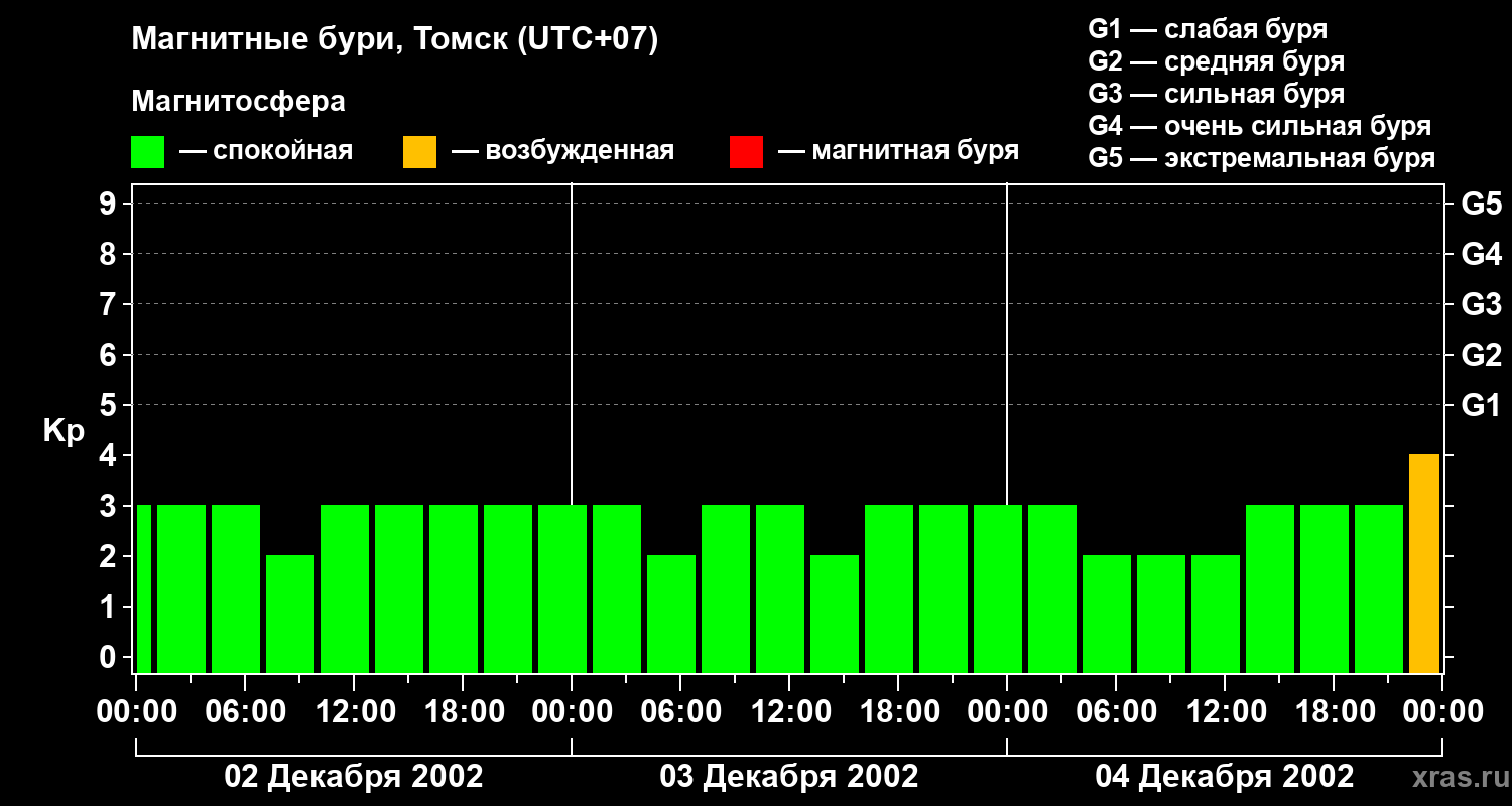 Изменения геомагнитного индекса Kp с 2 по 4 декабря 2002 года для средних широт
