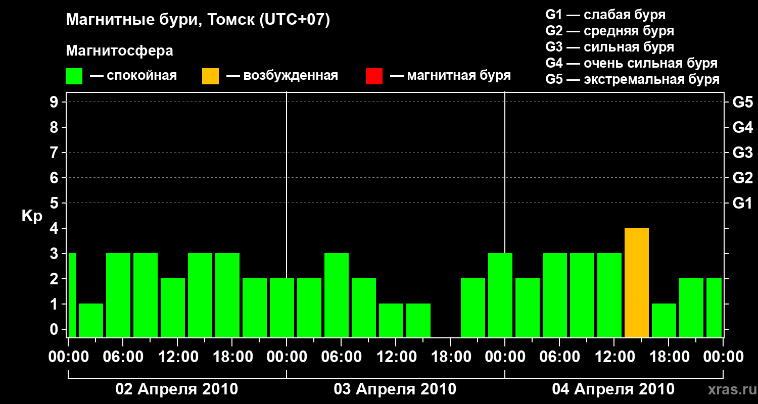 Изменения геомагнитного индекса Kp с 2 по 4 апреля 2010 года для средних широт