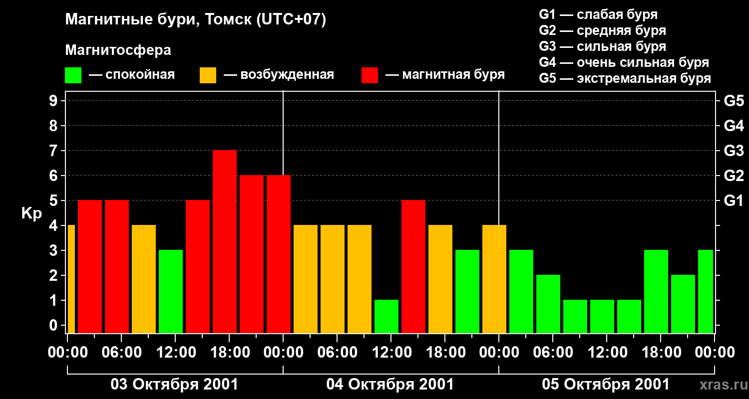 Изменения геомагнитного индекса Kp с 3 по 5 октября 2001 года для средних широт