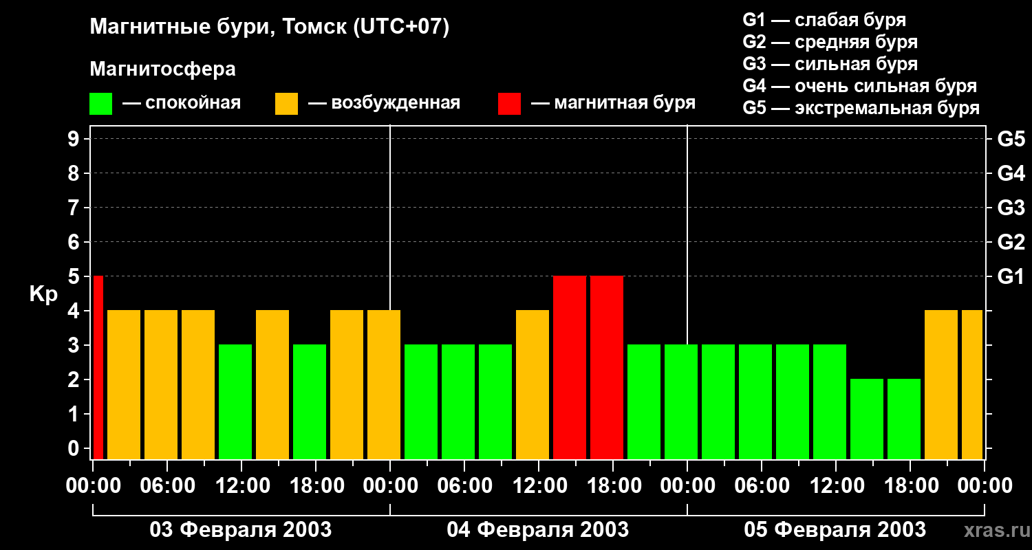 Изменения геомагнитного индекса Kp с 3 по 5 февраля 2003 года для средних широт