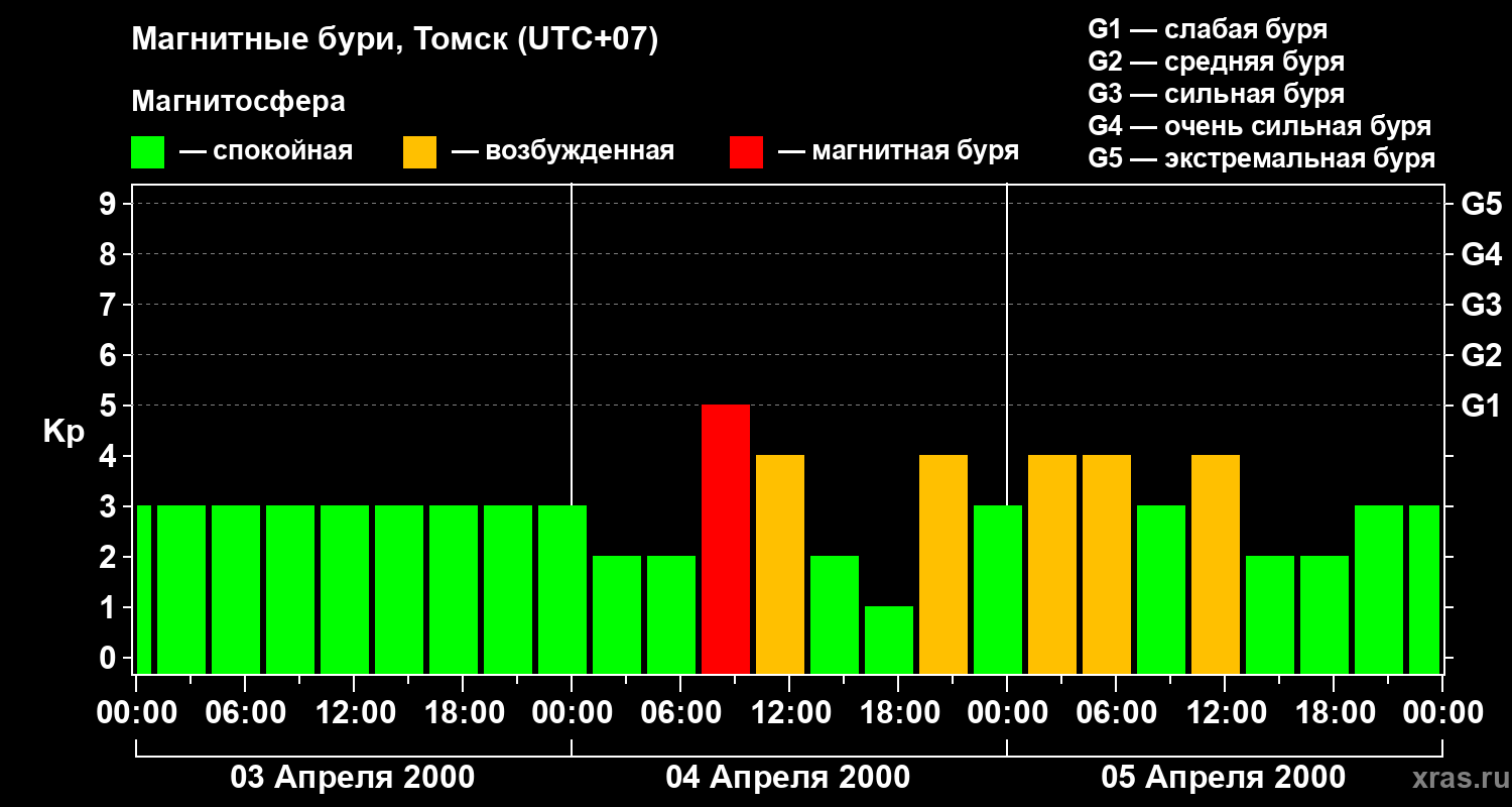 Изменения геомагнитного индекса Kp с 3 по 5 апреля 2000 года для средних широт