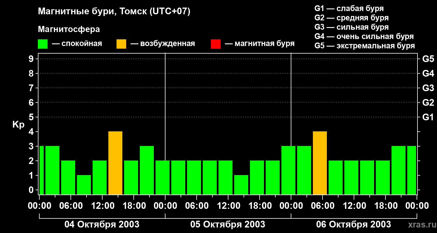 Изменения геомагнитного индекса Kp с 4 по 6 октября 2003 года для средних широт