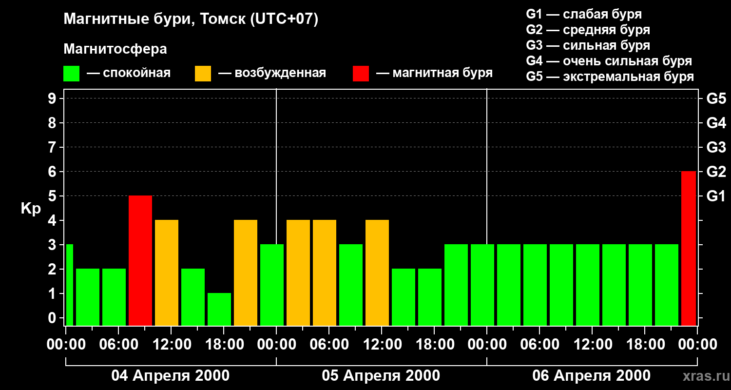 Изменения геомагнитного индекса Kp с 4 по 6 апреля 2000 года для средних широт