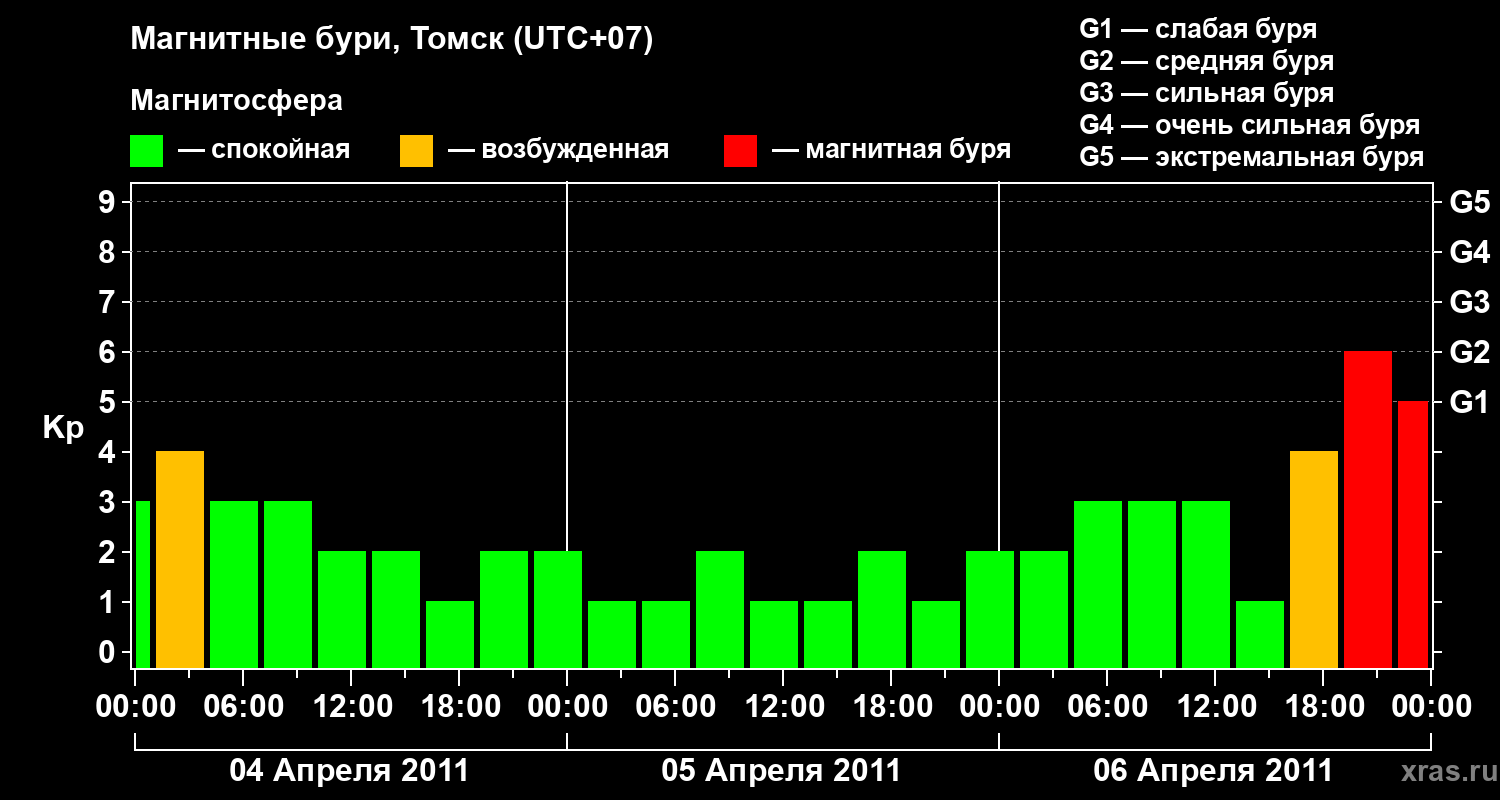 Изменения геомагнитного индекса Kp с 4 по 6 апреля 2011 года для средних широт