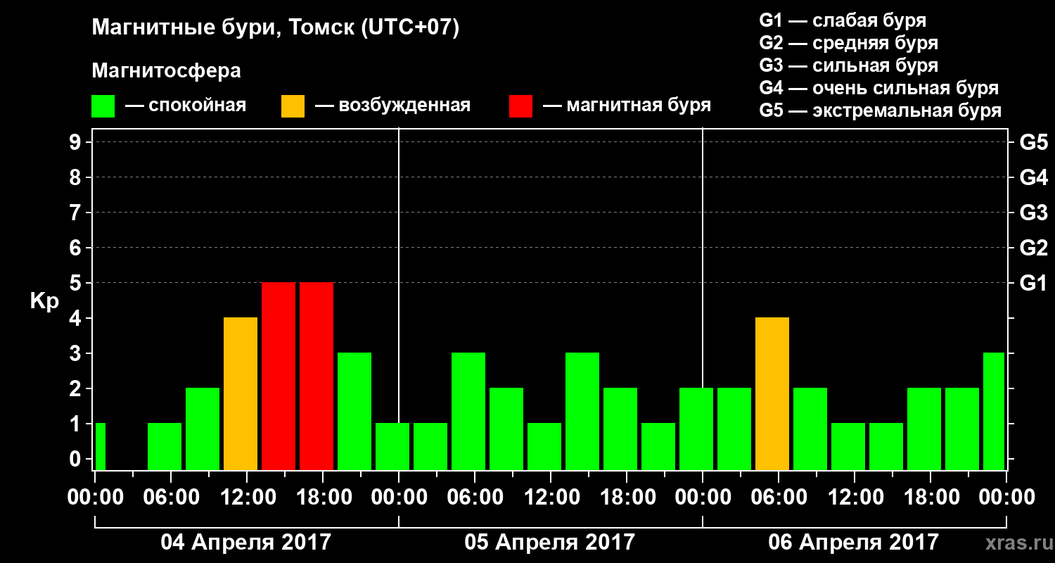 Изменения геомагнитного индекса Kp с 4 по 6 апреля 2017 года для средних широт