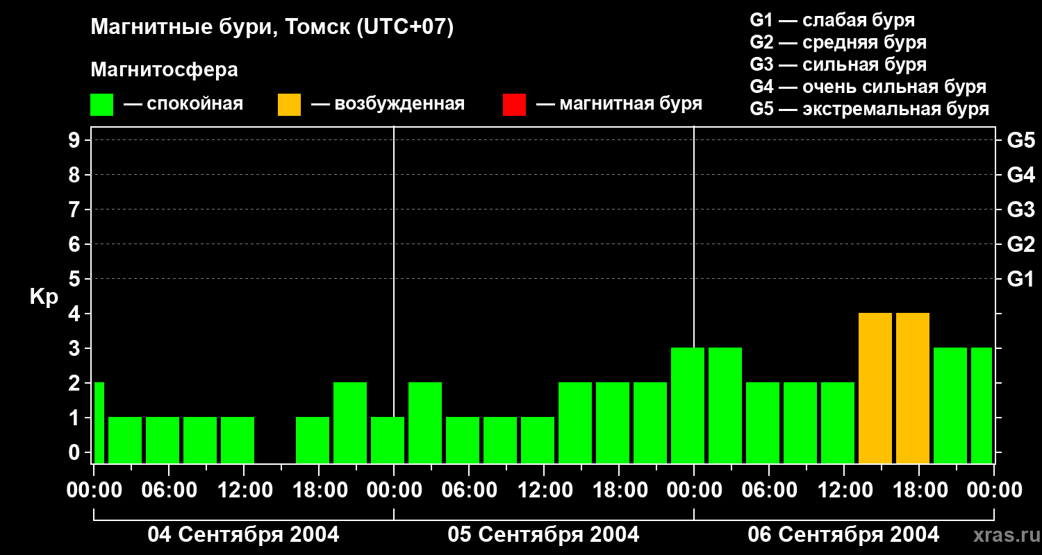 Изменения геомагнитного индекса Kp с 4 по 6 сентября 2004 года для средних широт