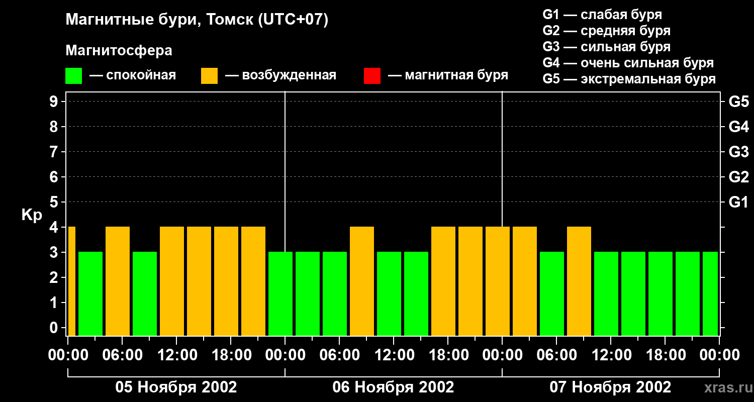 Изменения геомагнитного индекса Kp с 5 по 7 ноября 2002 года для средних широт