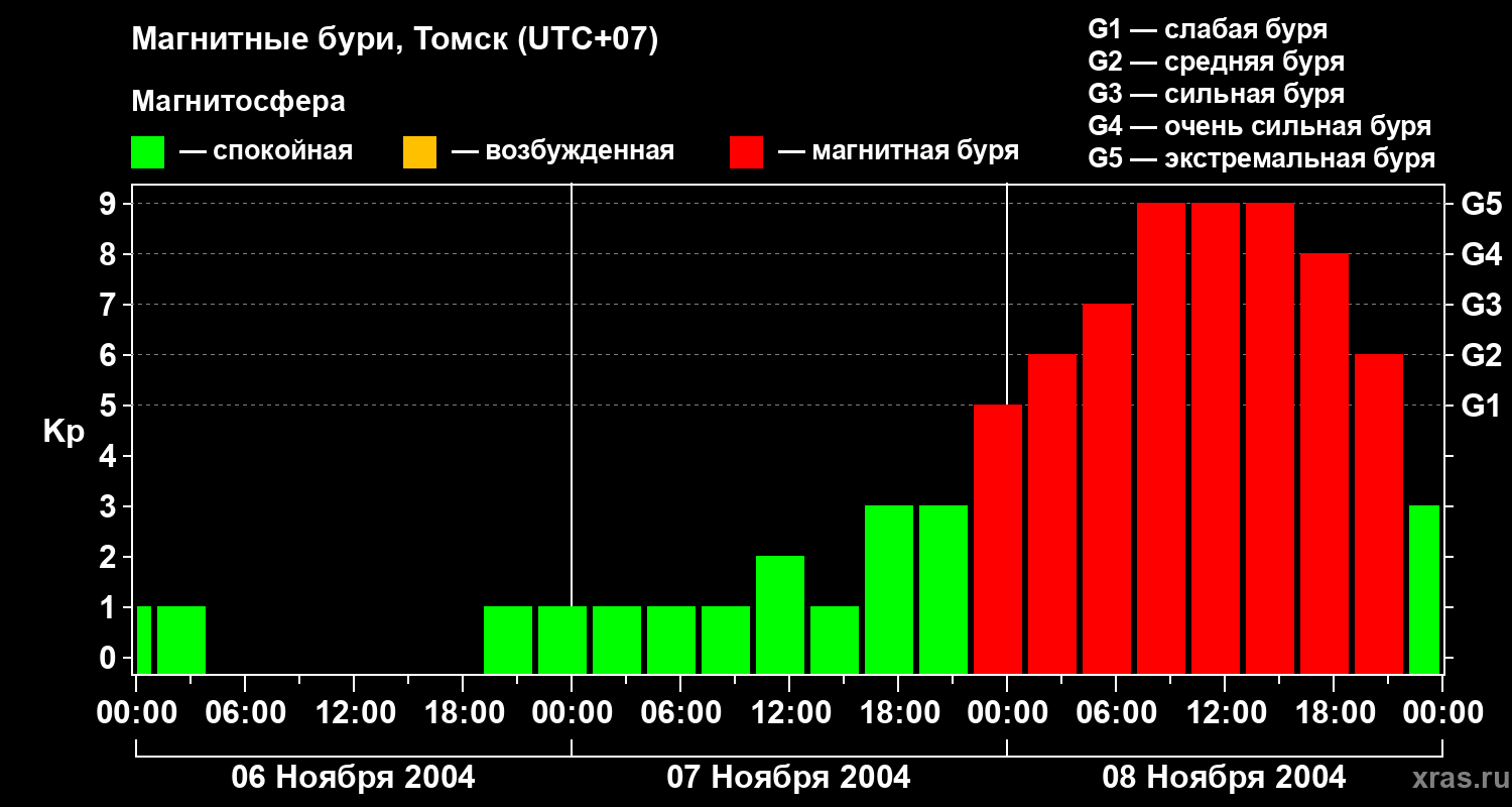 Изменения геомагнитного индекса Kp с 6 по 8 ноября 2004 года для средних широт