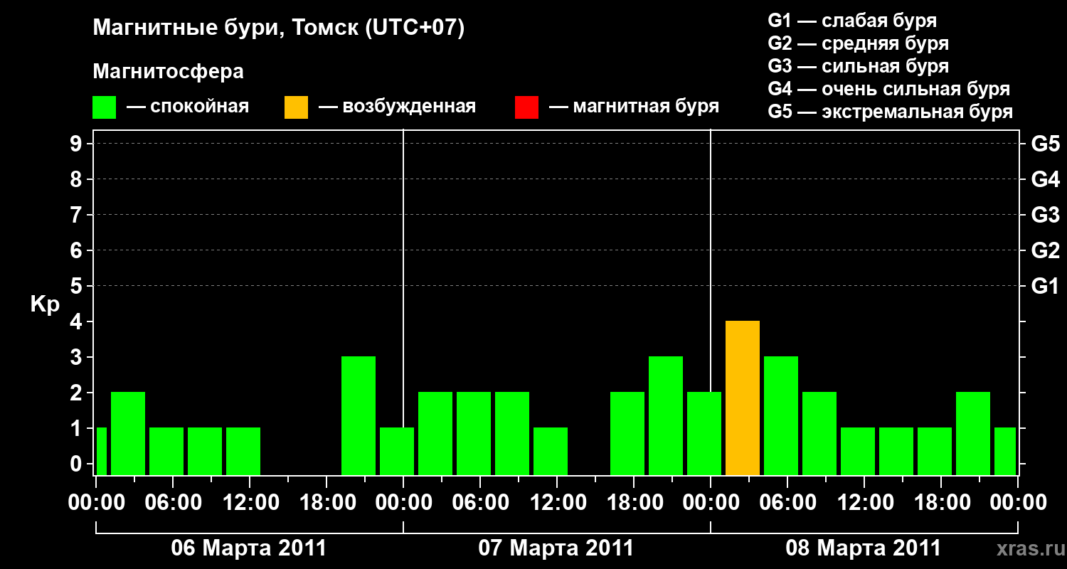 Изменения геомагнитного индекса Kp с 6 по 8 марта 2011 года для средних широт