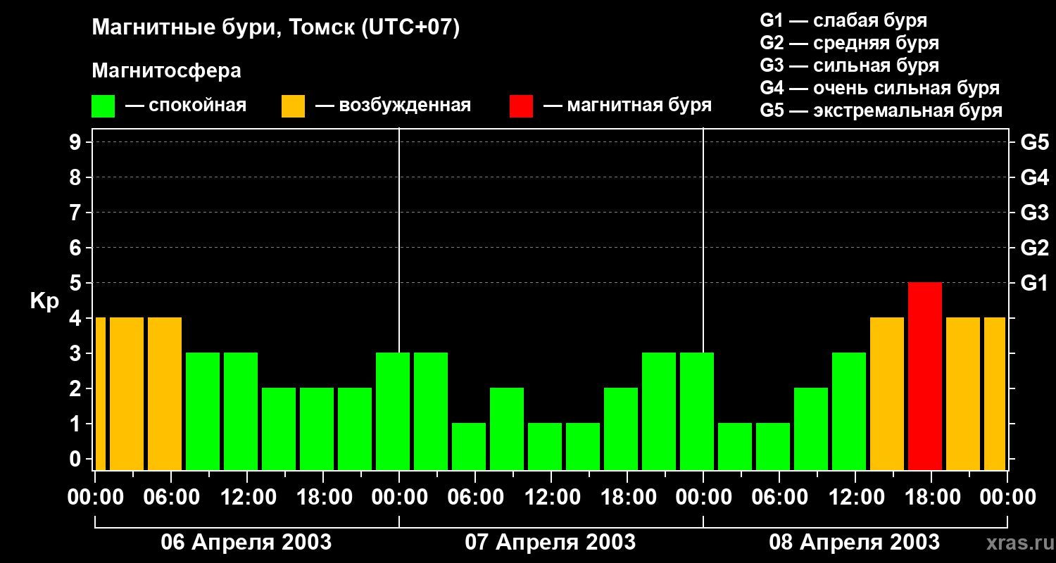Изменения геомагнитного индекса Kp с 6 по 8 апреля 2003 года для средних широт