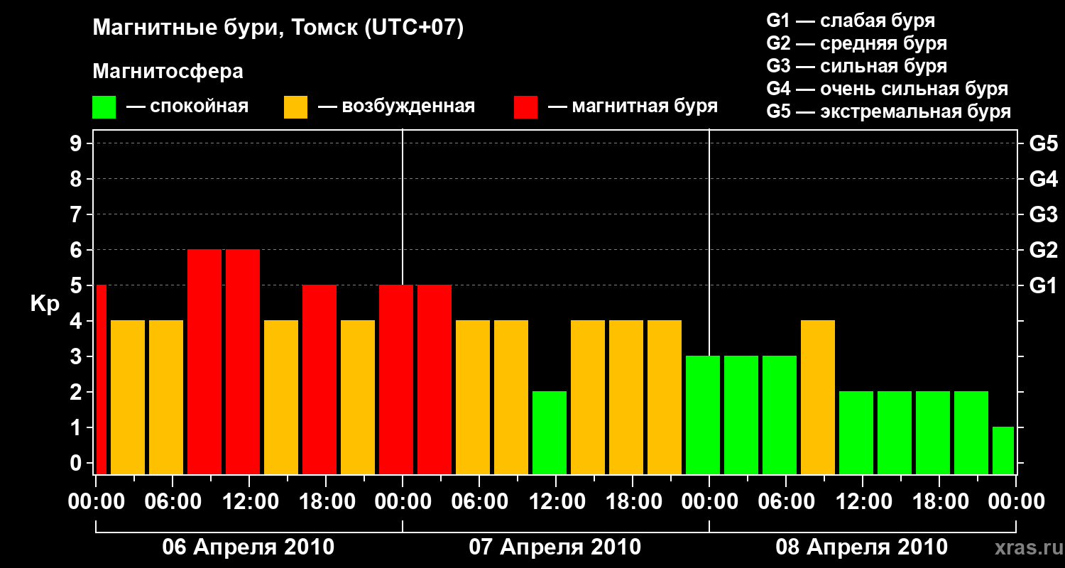 Изменения геомагнитного индекса Kp с 6 по 8 апреля 2010 года для средних широт