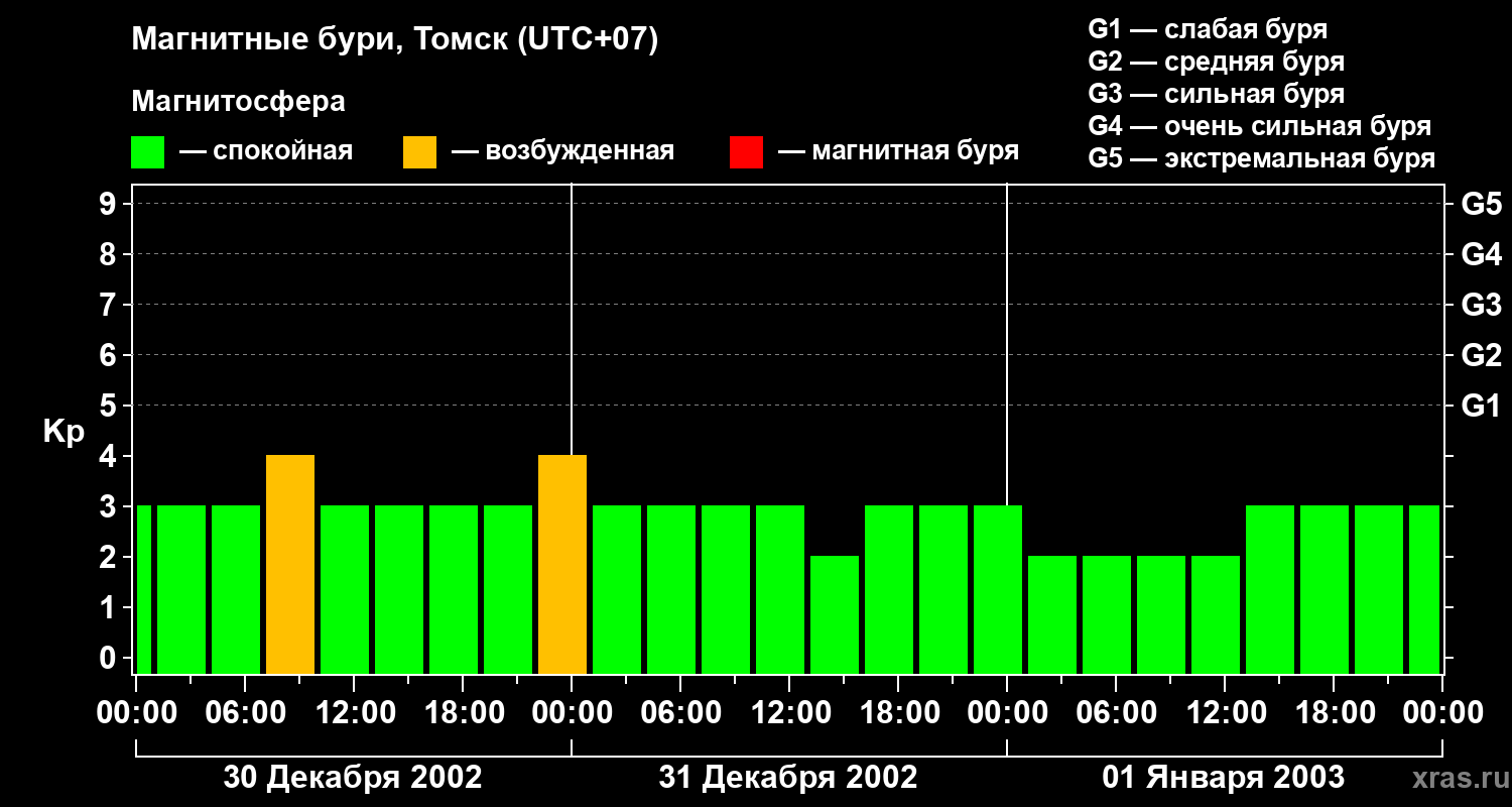 Изменения геомагнитного индекса Kp с 30 декабря 2002 года по 1 января 2003 года для средних широт