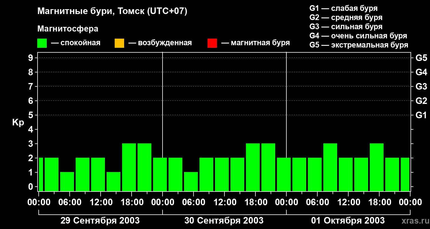 Изменения геомагнитного индекса Kp с 29 сентября по 1 октября 2003 года для средних широт