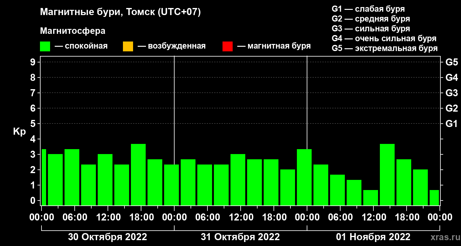 Изменения геомагнитного индекса Kp с 30 октября по 1 ноября 2022 года для средних широт