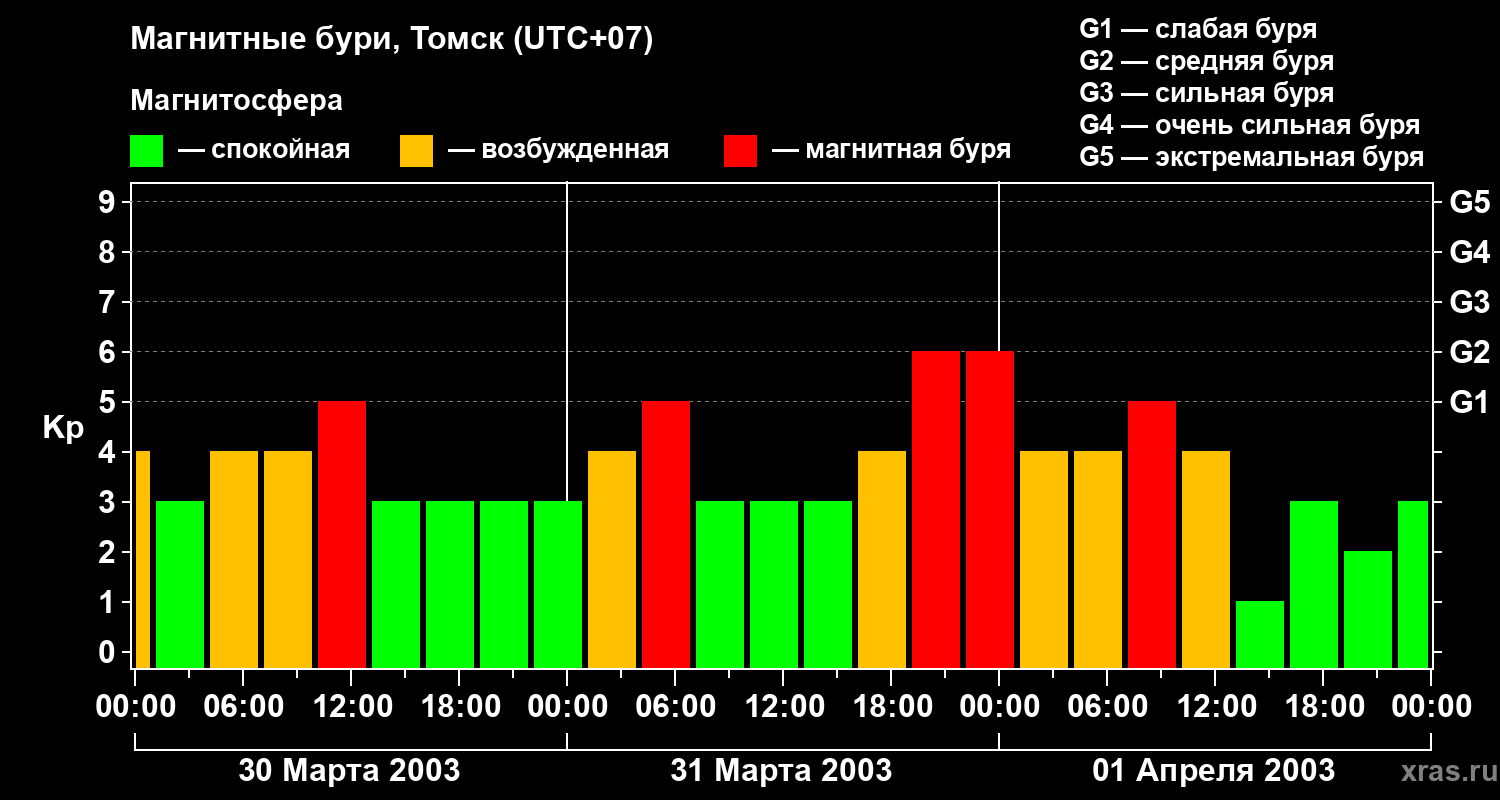 Изменения геомагнитного индекса Kp с 30 марта по 1 апреля 2003 года для средних широт