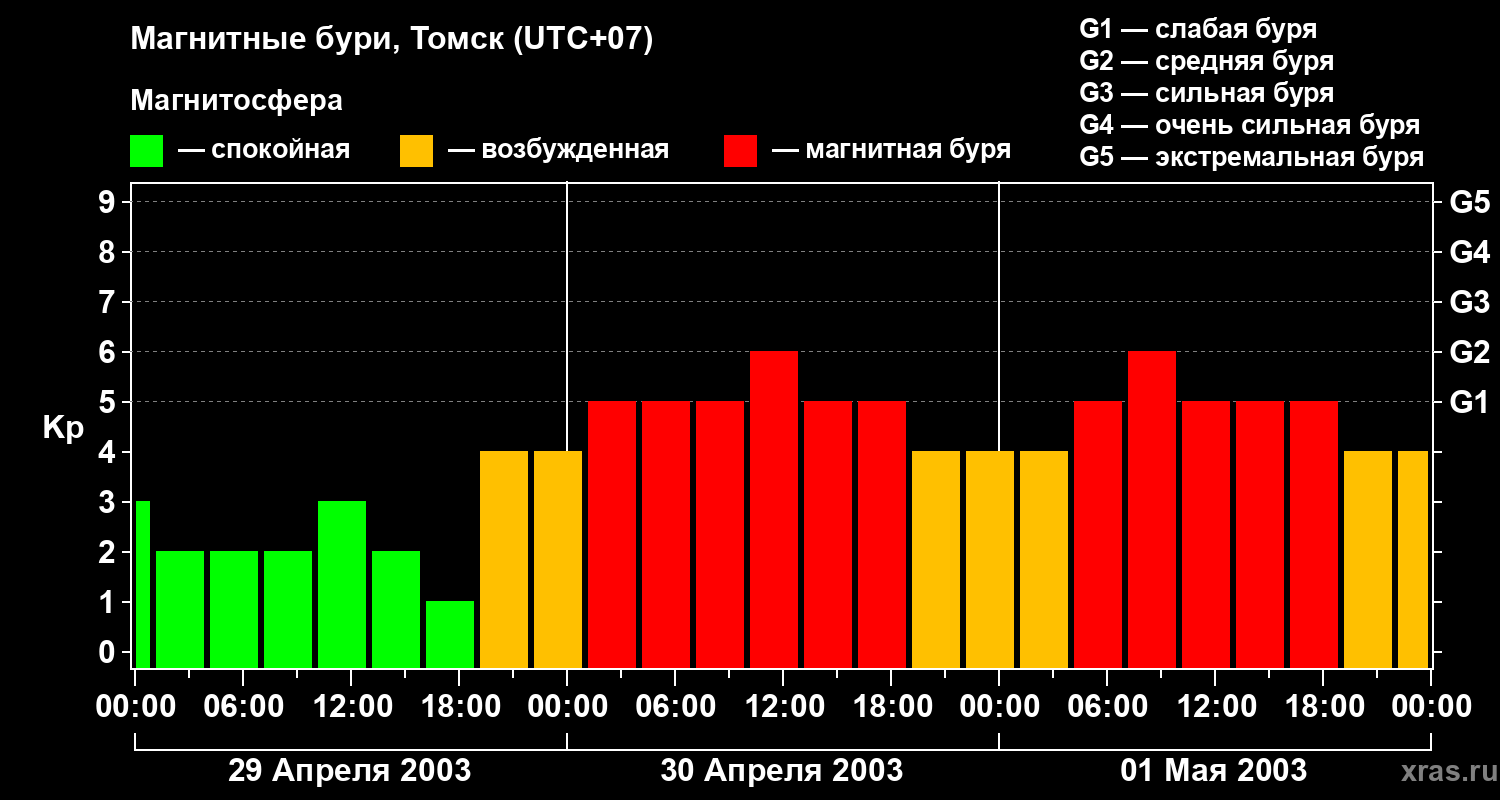 Изменения геомагнитного индекса Kp с 29 апреля по 1 мая 2003 года для средних широт